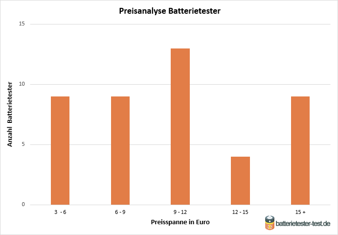 Um die Frage genauer zu beantworten, habe ich 44 Batterietester online untersucht. Dabei habe ich entdeckt, dass die meisten Tester von haushaltsüblichen Batterien 9€ bis 12€ kosten (13 von 44). Ebenso kosten viele Exemplare 3€ bis 6€, 6€ bis 9€ und mehr als 15€ (jeweils 9 von 44).