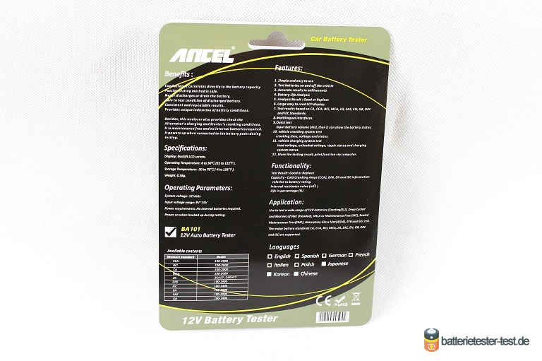 Der BA101 testet Autobatterien auf verschiedene Werte. Zu diesen zählen etwa die Ladung in %, die Spannung (v), den Widerstand (Ω) und der CCA-Wert. Diesen Daten lassen sich tiefgehend analysieren. Zu den weiteren Funktionen zählt etwa das Testen der Belastungsfähigkeit der Batterie. Zudem kann geprüft werden, ob die Batterie korrekt von der Lichtmaschine des Kfz geladen wird,