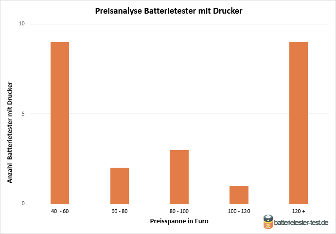 Dabei habe ich folgende Ergebnisse erhalten: Die Preisspanne geht bei Batterietestern mit Drucker geht weit auseinander. Es gibt sowohl Geräte für 40€ bis 60€ als auch Exemplare für (weit) mehr als 120€ zu kaufen (jeweils 9 von 24). Dazwischen gibt es hingegen nur wenige Batterietester mit Drucker zu kaufen.