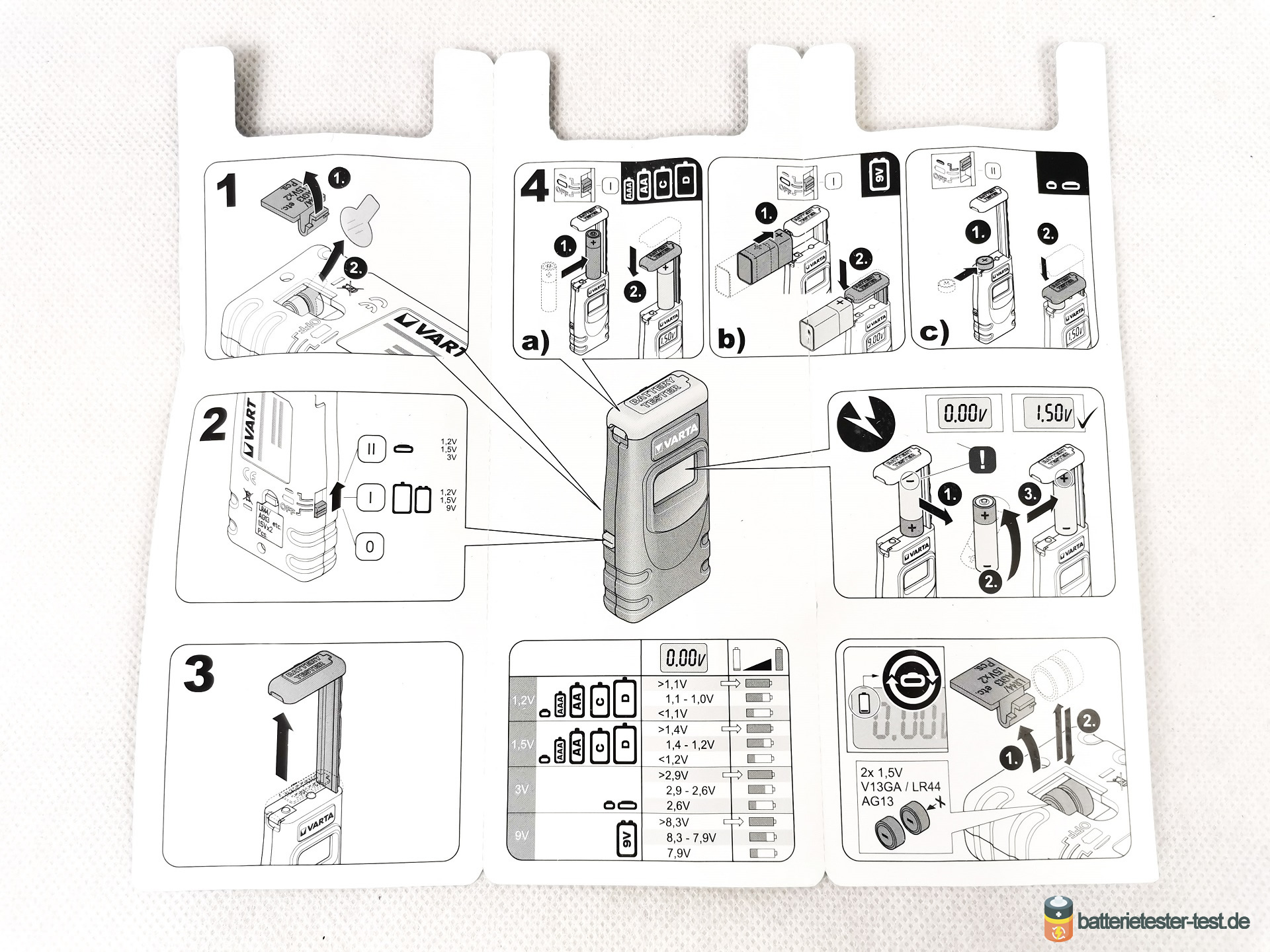 Der Lieferumfang fällt – typisch für einen Batterietester – sehr überschaubar aus. Neben dem Varta LCD Digital Battery Tester werden lediglich zwei Knopfzellen und eine Bedienungsanleitung mitgeliefert. Damit ist alles enthalten, was zum Betrieb des Gerätes benötigt wird. Zudem muss ich positiv hervorheben, dass die Anleitung sehr gut bebildert ist.